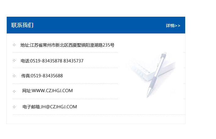 地址:常州市新北區友邦商務大廈1幢16、17層  電話:0519-85101652  傳真:0519-85112595  郵編:213022  網址:www_cz-jiayue_cn.he-mall.com  郵箱:xiajifengaa@163.com